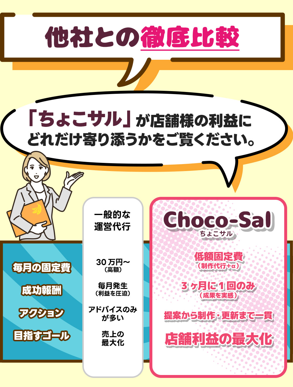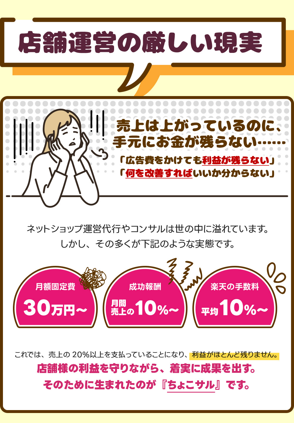 成果が出る前の段階で歩合をいただくのは、店舗様の利益を優先する「ちょこサル」のポリシーに反すると考えています。