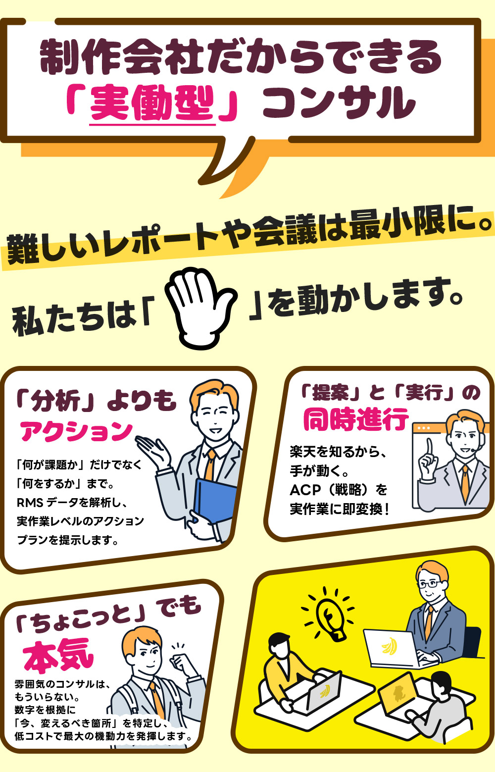 - 一番の違いは「手も動かす」ことです。コンサル会社は「分析と提案」までですが、弊社は制作会社ですので、提案した施策をその場でバナー作成やページ修正に繋げます。