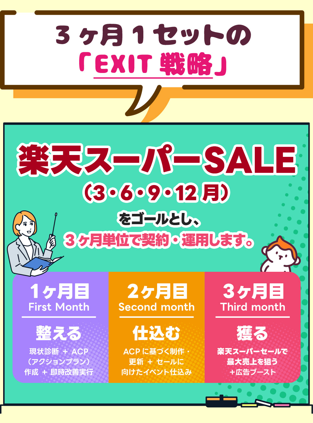 - 楽天市場の仕組み上、1ヶ月だけでは「施策→反応→改善」のサイクルを回しきれないからです。 スーパーセールという明確な山場をゴールに据え、そこに向けて「耕し、種をまき、 収穫する」という3ヶ月のプロセスが、 最も投資対効果(ROI)が高くなります。