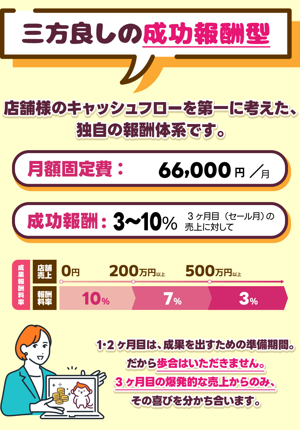 - 3ヶ月目の売上に対する歩合ですので、売上が上がらなければ弊社の報酬(歩合分)も少なくなります。弊社も「自分たちの利益のために、本気で売上を上げに行く」という覚悟を持って取り組むための仕組みです。